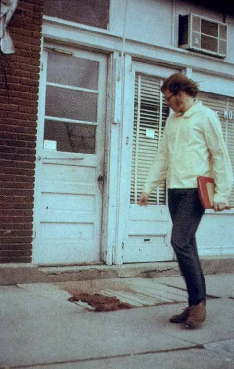 Ana Mendieta’s 1973 Moffitt Building Piece, one of her evocative super-8mm experimental films, investigates gender-based violence through a personal tragedy. The piece was created in response to the murder of Sarah Ann Ottens, a fellow University of Iowa student who was brutally assaulted and killed in her dormitory. During the staging phase, Mendieta uses animal blood and vitals to evoke an unfiltered viscerality and impending realism. The pool of fresh blood, spread across the pavement, transforms the space into an unsettling recreation stripped entirely of context. The conscious dismissal of a narrative leaves the bystanders to construct their own interpretations as to what might have happened. Meanwhile, in a nearby car, Mendieta documents these interactions from a vantage point. The full scope of the work unfolds over the course of the day as she captures the unsuspecting witnesses experiencing the implied violence.
